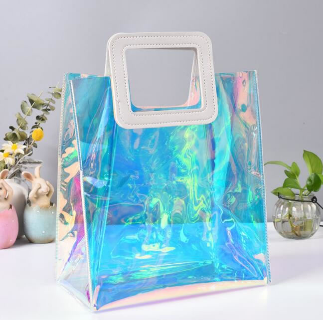 透明果凍炫彩禮品幻彩鐳射手提袋定制logo時(shí)尚街拍PVC單肩背包袋,制鐳射幻彩皮革手提包透明塑料袋彩色炫彩斜挎手提袋